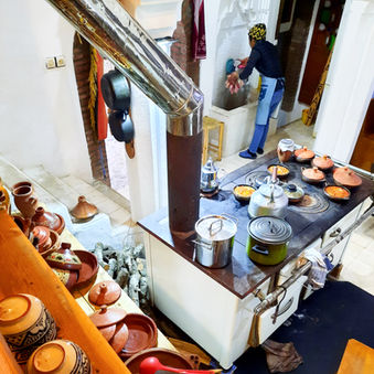 Mit Blick auf die offene Küche, wo die Tajines und Töpfe auf dem heißen Feuerofen köcheln, können Sie gemütlich Platz nehmen für eine leckere Mahlzeit.